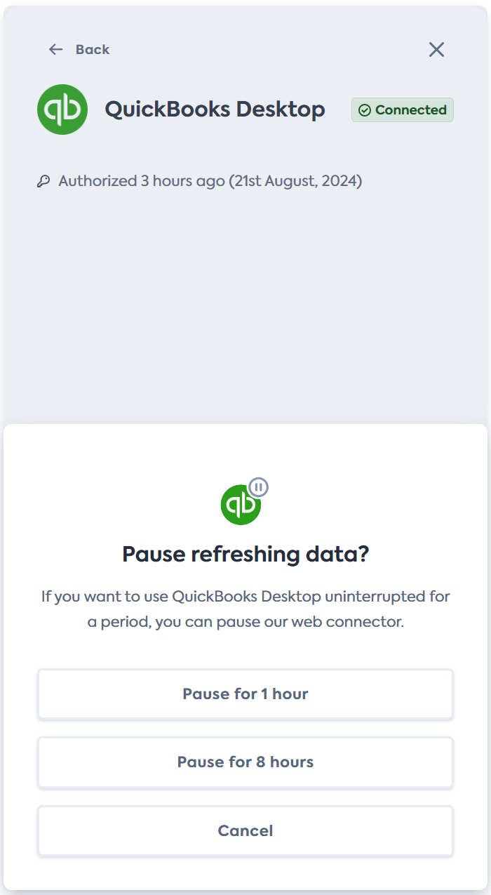 To support a seamless user experience, enable your user to pause the syncSync The process of fetching the latest data from a connected data source. Syncs can be triggered manually or run automatically on a schedule. when they need to access QBD. You can easily do this with our Connections SDK. This embeddable component enables your users to pause ongoing or future syncsSync The process of fetching the latest data from a connected data source. Syncs can be triggered manually or run automatically on a schedule. for a set period as well as manage their data connectionsConnection A link between a Codat company and a data source (like an accounting platform). Each connection represents authorized access to pull or push data from that platform.. The pause functionality is only required for QBD connectionsConnection A link between a Codat company and a data source (like an accounting platform). Each connection represents authorized access to pull or push data from that platform..